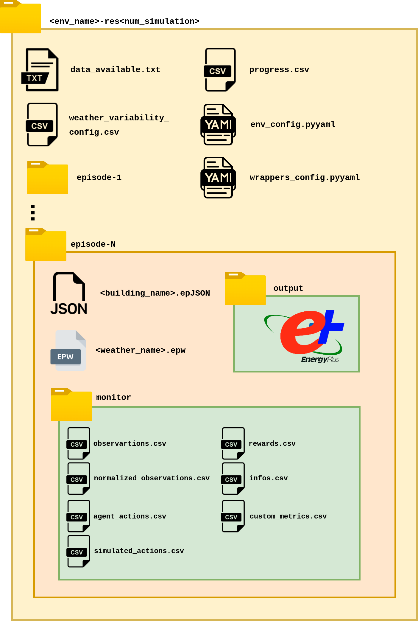 progress.csv. This file contains information about general simulation results. Each row contains episode information registering relevant data such as mean power consumption, rewards or comfort penalties. This file is only available when the environment has been wrapped with aLoggerWrapperandCSVLogger(see Logger Wrappers for more information). The structure of this file is defined by theLoggerWrapperclass.weather_variability_config.csv. This file contains the configuration of the weather variability for each episode. It is only created when the environment has been wrapped withLoggerWrapperandCSVLogger. It is very useful when you are using ranges in weather variability parameters (more information in Weather variability)data_available.txt. It is generated when the EnergyPlus API initializes all callbacks and handlers for the simulation. In this file, you can find all the available components of the building model, such as actuators, schedulers, meters, variables, internal variables, etc.mean.txt,var.txtandcount.txt. These files contain the count, mean and variation values for calibration of normalization in observation space if wrapperNormalizeObservationis used (see NormalizeObservation).env_config.pyyaml. This file contains the environment configuration in YAML format. It is automatically generated when the environment is created and includes all the parameters used to instantiate the environment, such as the building model, weather file, simulation settings, and any user-defined configurations. For more information, see the Environment Configuration Serialization section.wrappers_config.pyyaml. This file contains the configuration of the wrappers applied to the environment, formatted in YAML. It is generated by calling get_wrappers_info(env) after the wrappers have been applied. The file includes all parameters used to instantiate the wrappers, such as normalization settings, action scaling, and any user-defined configurations. For more information, see the Wrapper Serialization and Restoration section.evaluation/. This directory contains the best model obtained during the training process. It is only created when the environment has been used with Stable Baselines 3 and wrapped withLoggerEvalCallback(see LoggerEvalCallback). The structure of this directory is as follows:best_model.zip. This file contains the best model obtained during the training process. It is saved in a compressed format.mean.txt,var.txtandcount.txt. Same as the files in the root directory, these files contain the count, mean and variation values for calibration of normalization in observation space, but for best model evaluation moments.evaluation_summary.csv. This file contains the evaluation summaries in CSV format. The structure of this file is defined by theLoggerEvalCallbackclass.