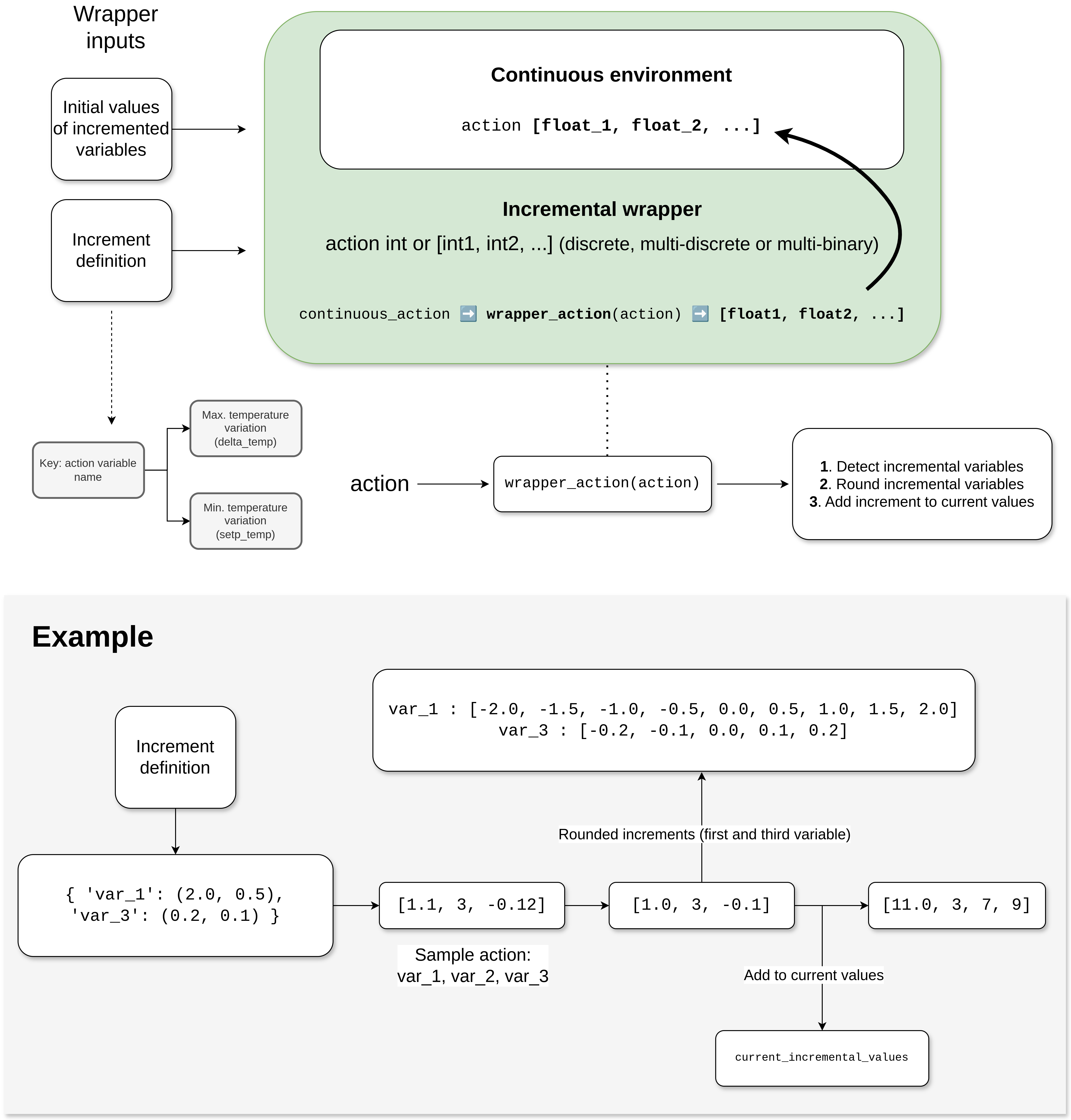 This wrapper updates an environment, transforming it into a discrete environment with an action mapping function and action based on the specified delta and step. The action is added to the current setpoint values rather than overwriting the last action. Therefore, the action is the current setpoint with the increment, rather than the discrete value action which is intended to define the increment/decrement itself.